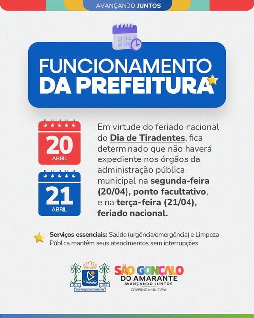 Em virtude do feriado nacional de Tiradentes, o Governo Municipal de São Gonçalo do Amarante informa que não haverá expediente nos órgãos da administração pública municipal […]